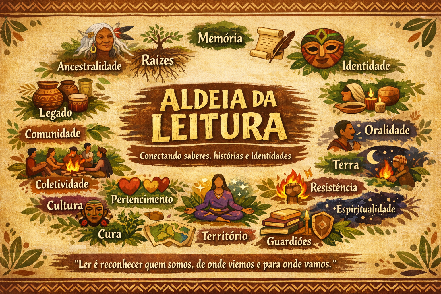 A atividade Aldeia da Leitura tem como objetivo promover a reflexão dos estudantes sobre valores culturais, sociais e identitários, por meio da leitura, oralidade e