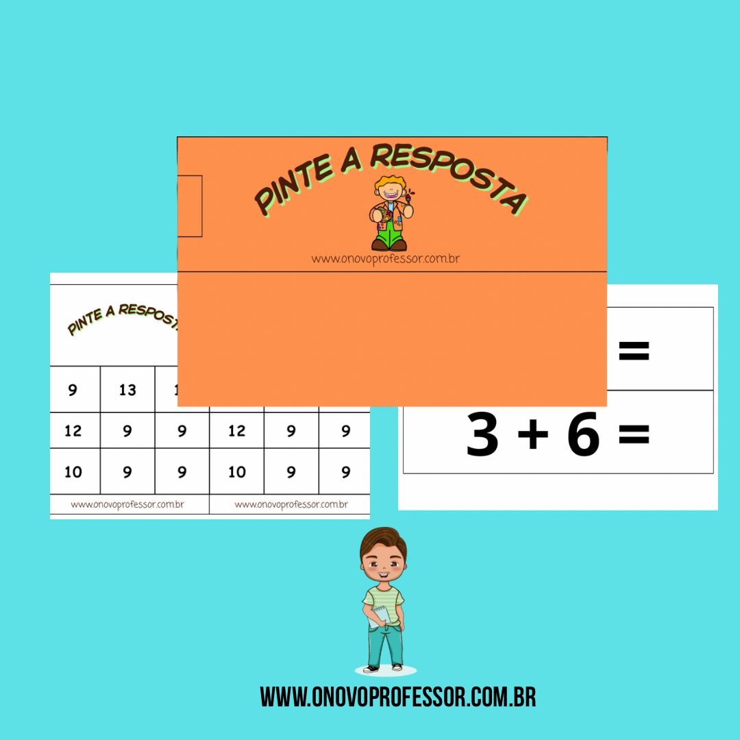 A atividade “Pinte a resposta” propõe que o estudante resolva operações de adição simples e identifique o resultado correto colorindo o número correspondente. A proposta