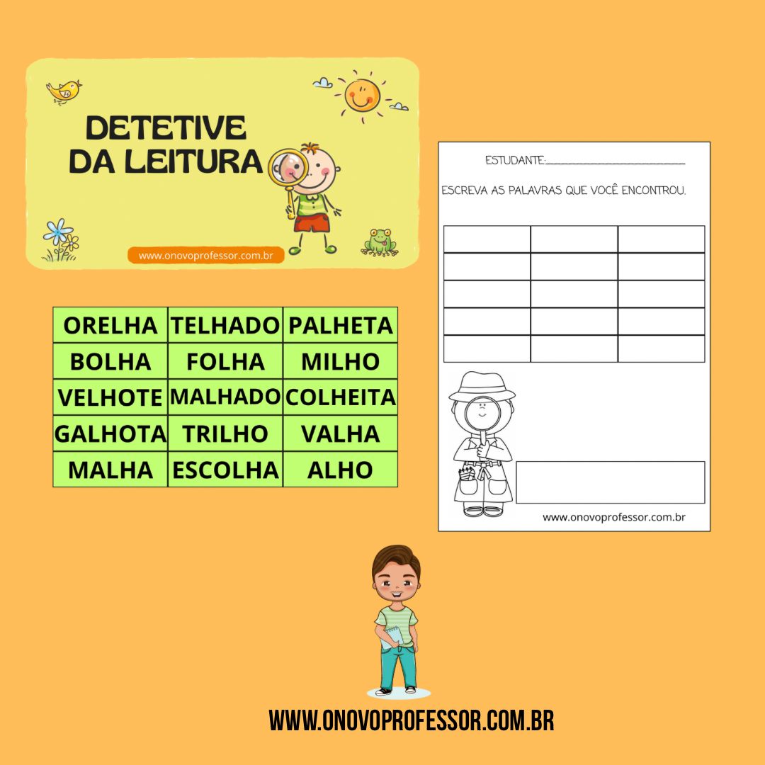 A atividade propõe que o estudante identifique e escreva palavras que contenham o dígrafo “LH”, como orelha, telhado, palheta, bolha, folha, milho, entre outras. O