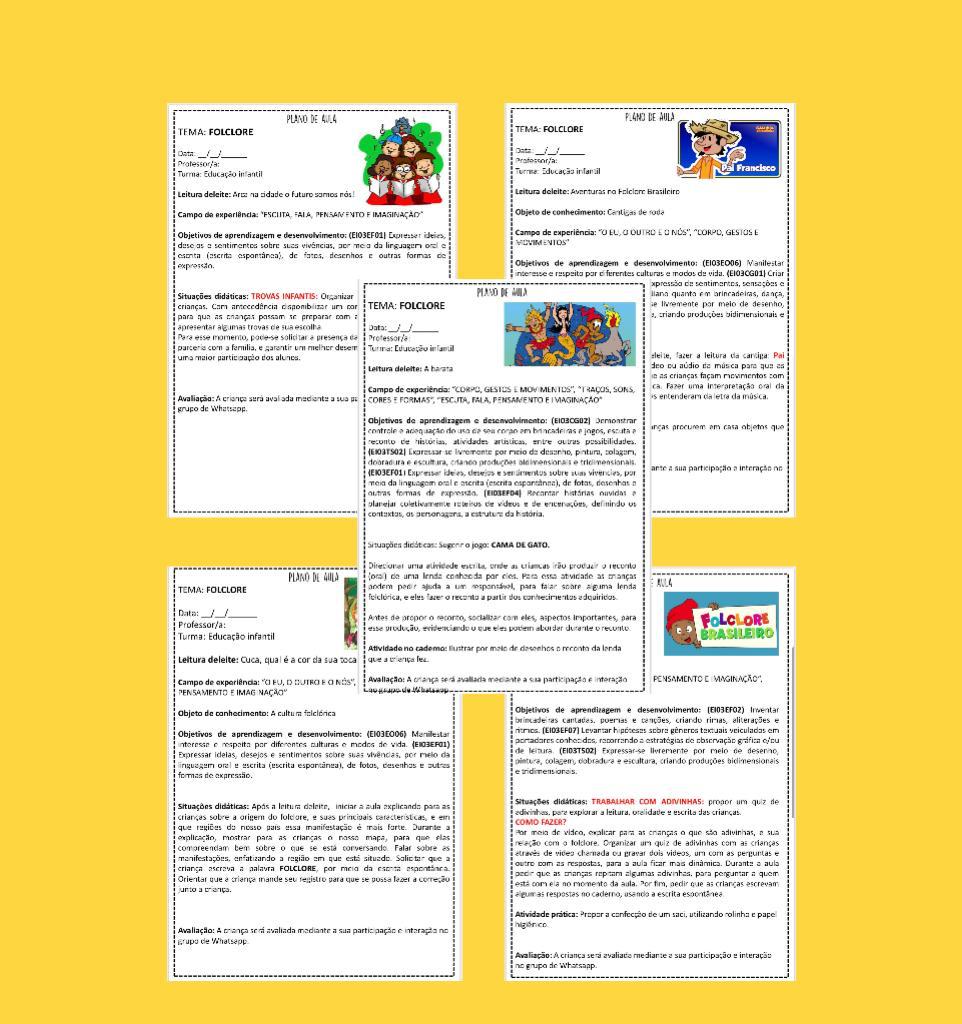 Planejamento para uma semana (5 dias) – Educação Infantil. Apresento a vocês uma proposta de trabalho para uma semana. A temática abordada é FOLCLORE, são atividades apropriadas para o ensino remoto.