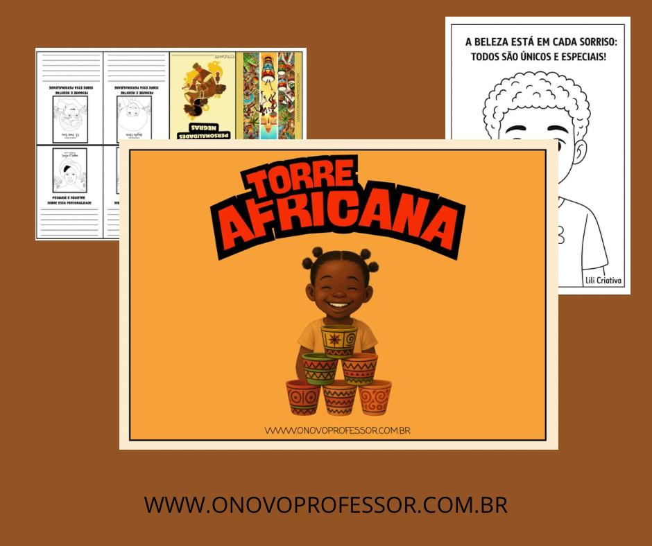 A atividade “Torre Africana” propõe desafios matemáticos de multiplicação e divisão, baseados em situações do cotidiano africano, como feiras, danças e artesanato.